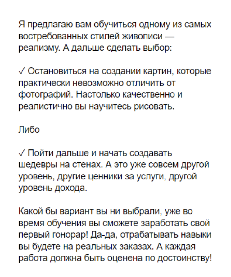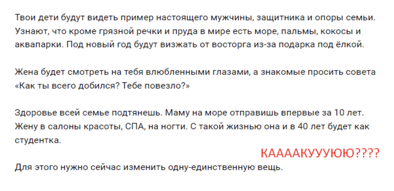 Важно: плотность ситуаций, образов, метафор, которые будут знакомы ЦА. Именно через них надо давить на больное и показывать светлое будущее. Иначе внимание ЦА быстро рассеется перед текстом.