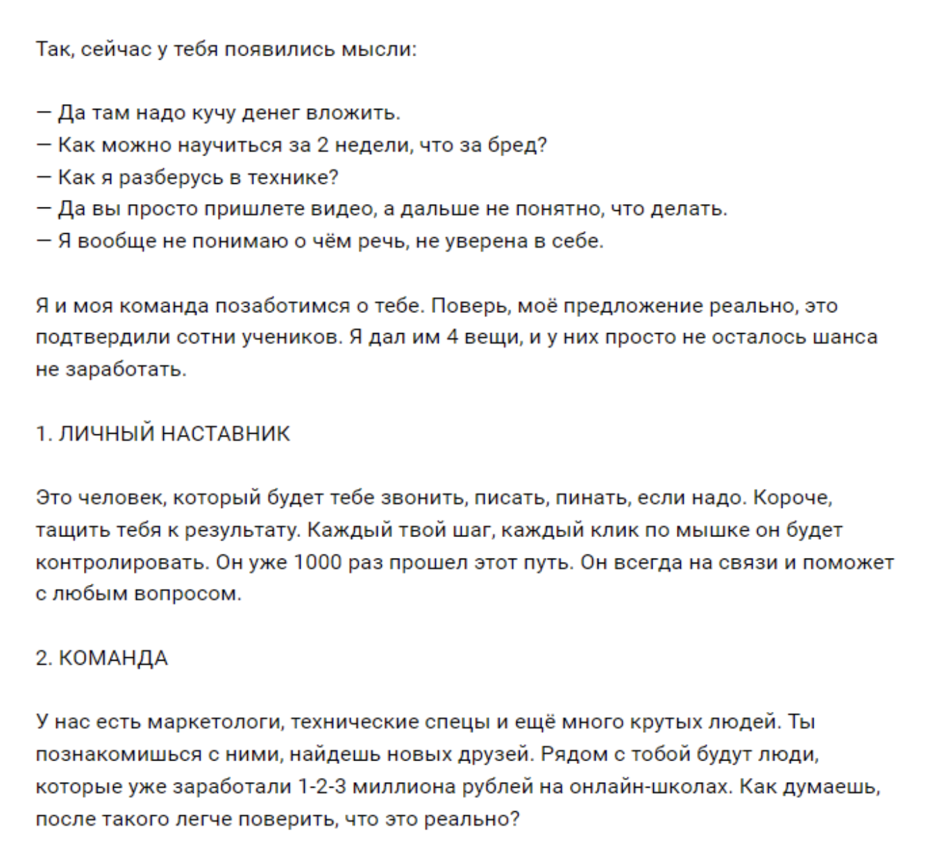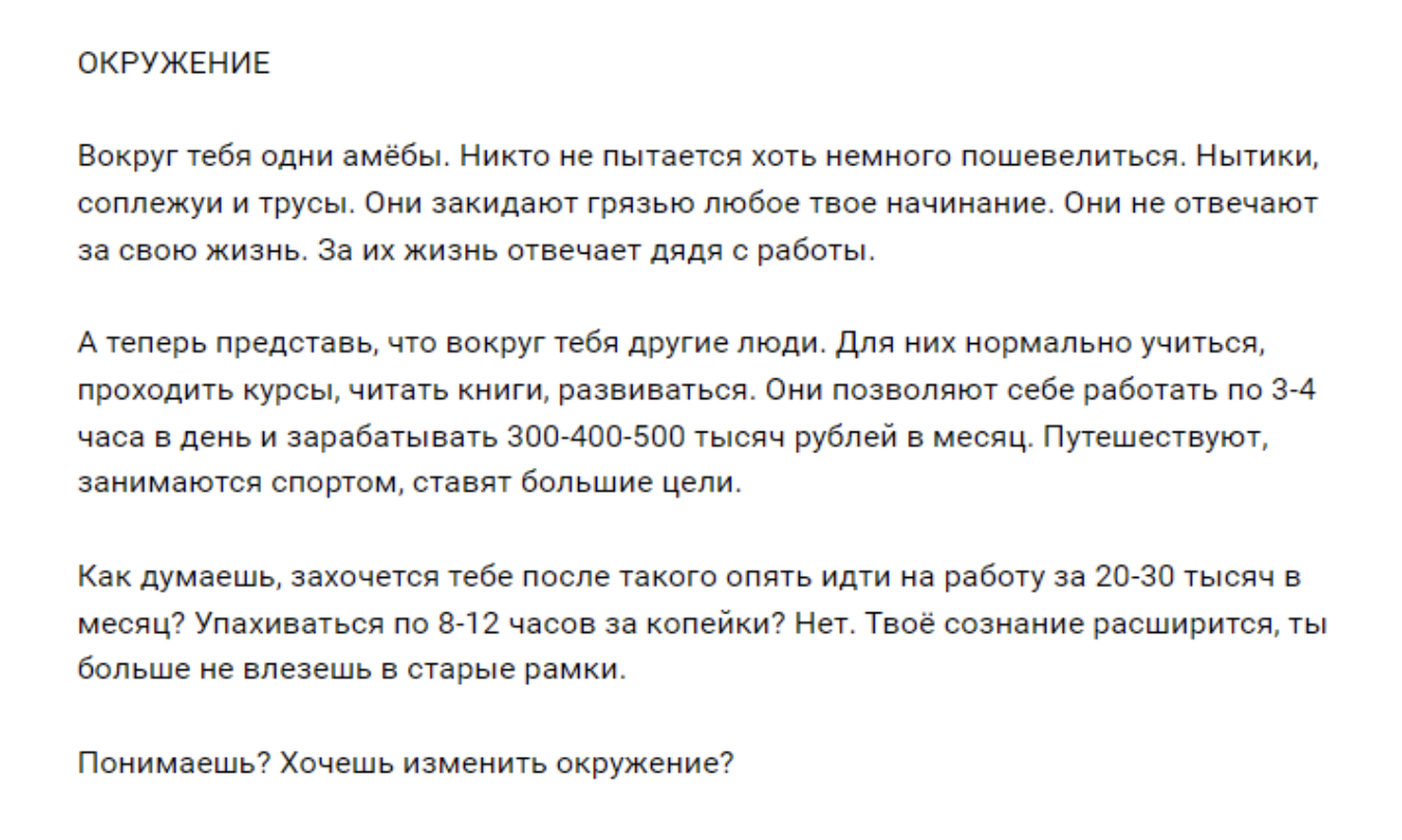 Как видите, много деталей и описания часто встречающихся проблем в широких массах. Это нужно для синхронизации с аудиторией. Чтобы каждый нашел в этой истории частичку себя с наибольшей вероятностью.